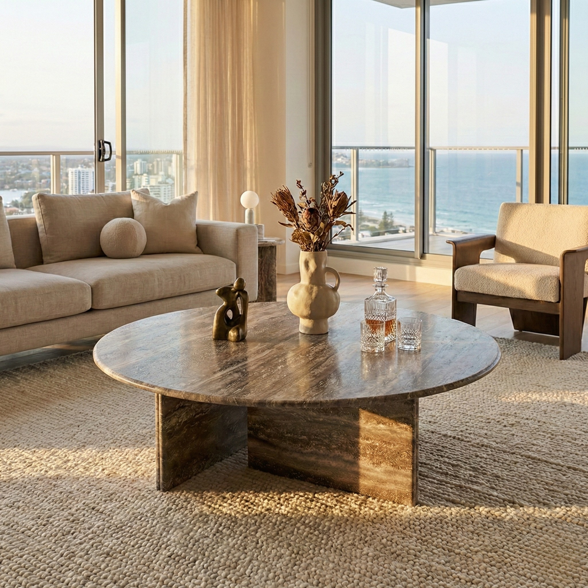 The surface reveals travertine in its most refined state soft pores, gentle tonal movement, and a texture shaped by nature alone. No two tables are identical. Each piece carries its own signature, making it inherently exclusive.
